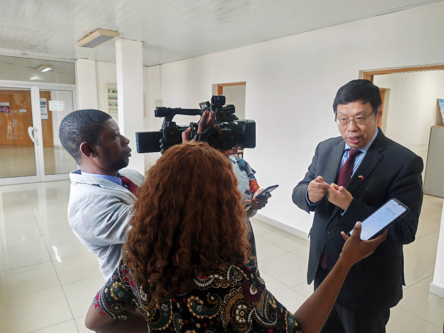 拜会结束后,王大使接受赤几国家电视台采访。